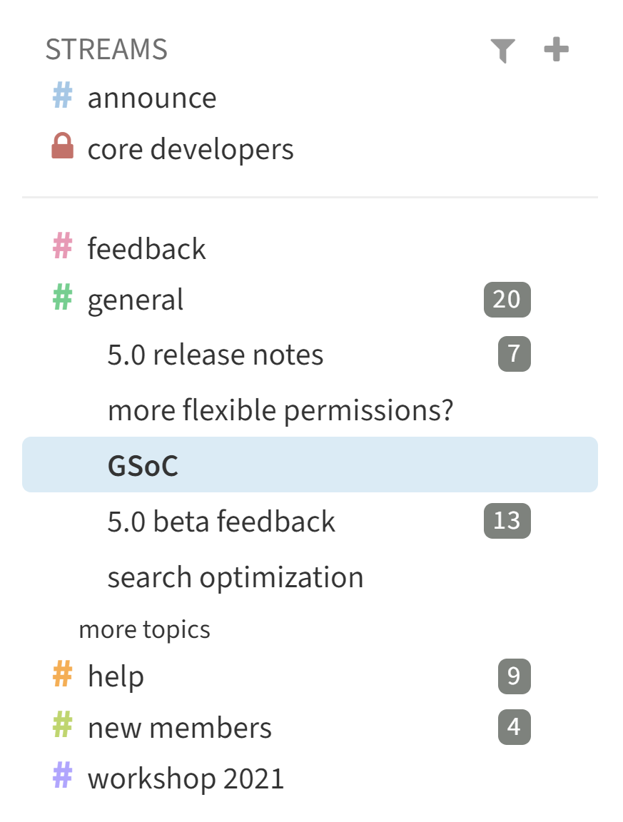 • Like email threads, Zulip topics create a separate space for each discussion, so different conversations will never get in each other’s way.